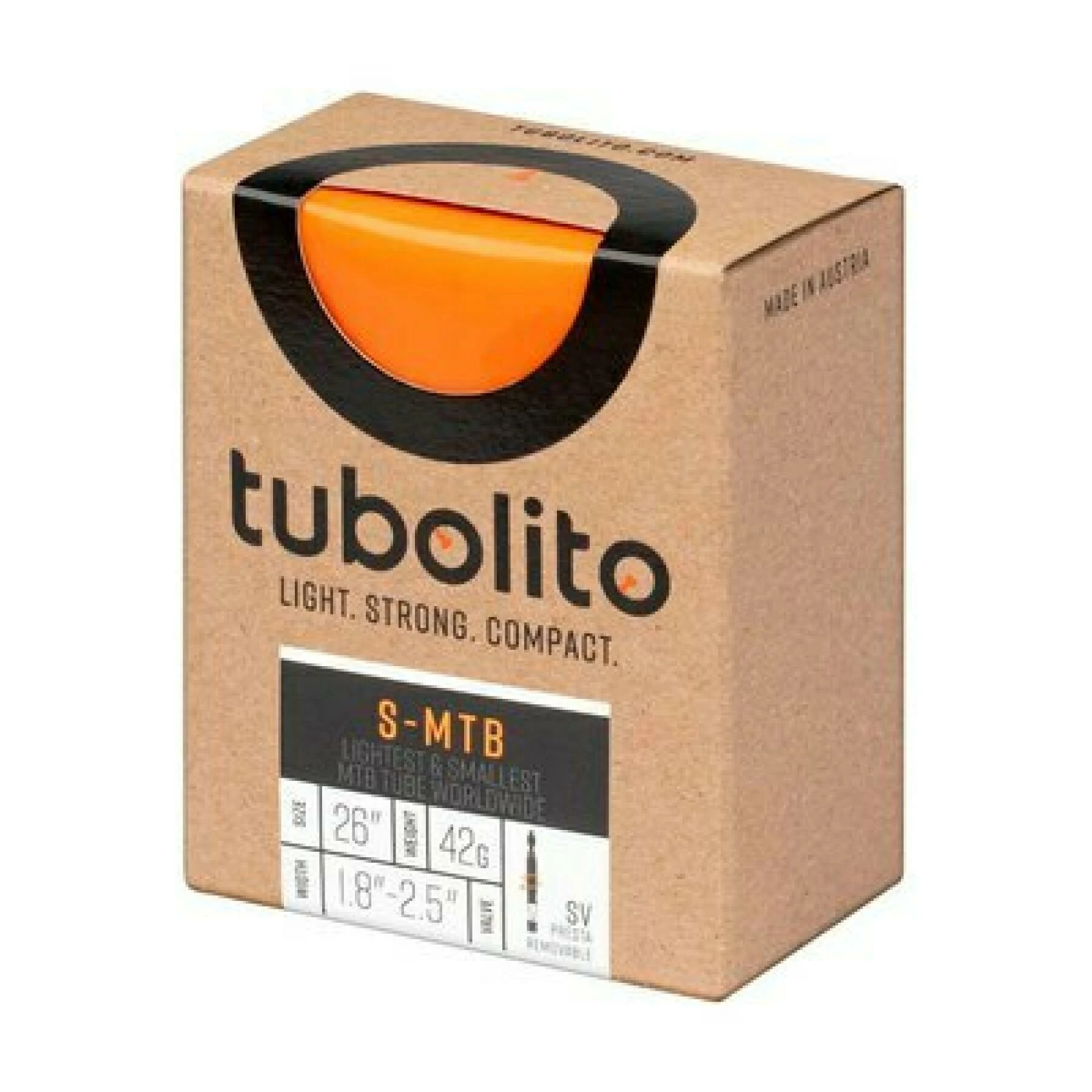 Rechange : La ligne de produits S-Tubo-MTB a été développée pour avoir une taille d’emballage minimale. Avec une tige de valve amovible, les tubes ont une taille de seulement Ø 3,5 cm x 5 cm de hauteur une fois emballés. La résistance à la perforation est la même que celle des chambres à air standard en caoutchouc butyle, pour un poids de seulement 45 g (pour 29). Diamètre : 26 Poids : +- 42 g Largeur du pneu : 1,8-2,5 Valve : Presta 42 mm