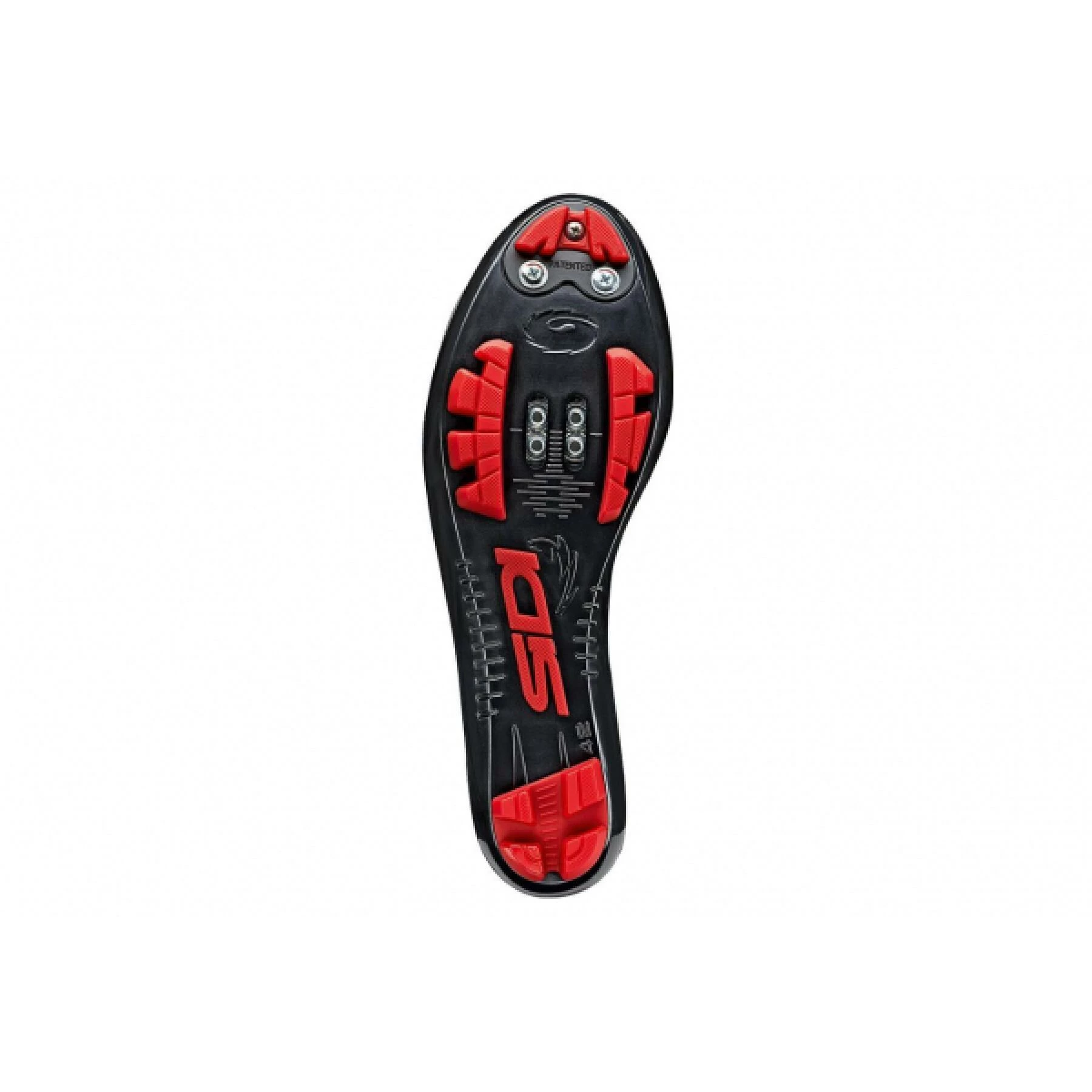 Plus légère et plus performante, la nouvelle semelle Sidi MTB est fabriquée en nylon avec des inserts en PU (polyuréthane). La forme de la semelle a été spécialement conçue pour le VTT, elle permet une bonne adhérence, facilite la dispersion de la boue et assure une bonne stabilité. L’insert central avec le logo Sidi fonctionne comme un antidérapant et il est pratique et utile surtout pour les utilisateurs moins expérimentés. La zone des orteils qui est plus sujette à l’usure, notamment lors de la marche, peut être remplacée par des vis et offre toujours la possibilité de monter des crampons pour améliorer la traction sur les terrains particulièrement boueux. La SR17 représente le résultat final en termes de rigidité pour le pédalage et de flexion pour la marche.